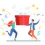 Couple winning prize. Man and woman holding gift box flat vector illustration. Lottery, present, birthday party concept for banner, website design or landing web page