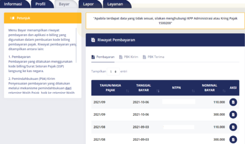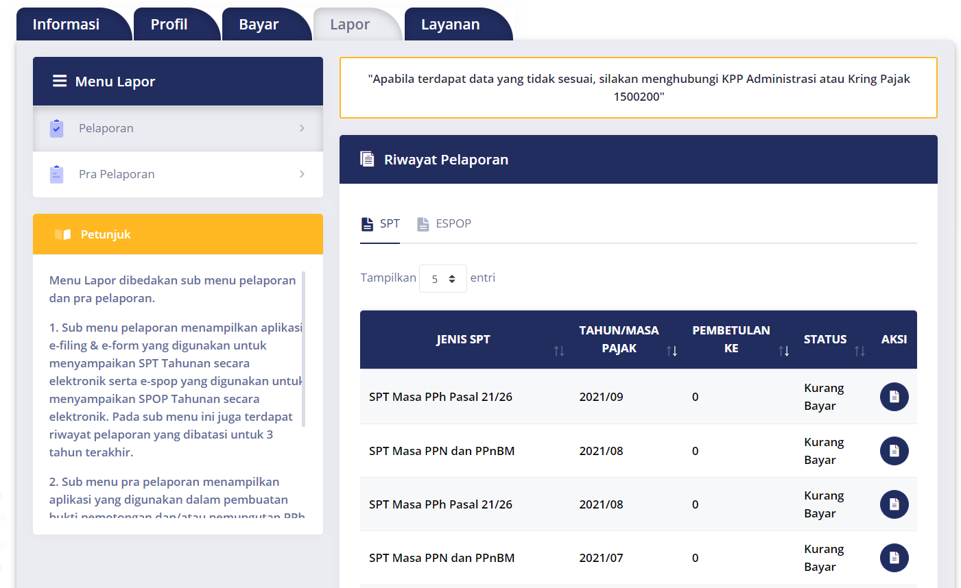 Pada bagian ini juga terdapat riwayat pelaporan yang dibatasi untuk 3 tahun terakhir. Apabila terdapat data pelaporan yang tidak sesuai, wajib pajak dapat menghubungi Kring Pajak 1500200 atau KPP administrasi.