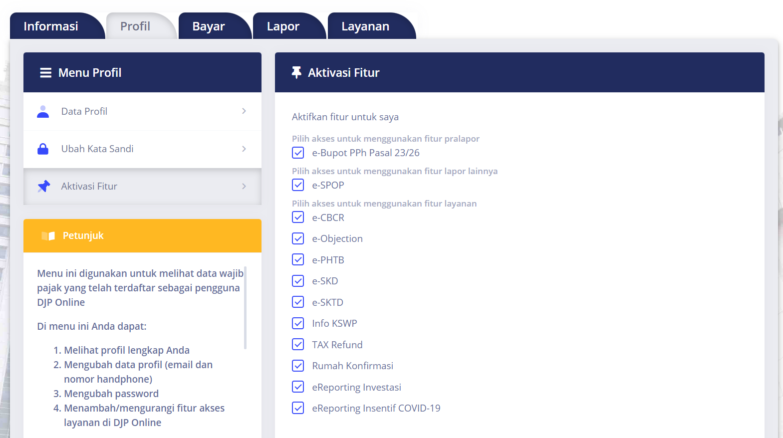 Jenis layanan yang disajikan merupakan layanan-layanan yang telah diakses oleh wajib pajak, baik secara online melalui situs web pajak maupun offline di KPP. Jika pada menu Layanan wajib pajak tidak terdapat salah satu dari menu di atas, wajib pajak perlu mengaktifkan fitur pada menu Profil bagian Aktivasi Fitur. Apabila terdapat data layanan yang tidak sesuai, wajib pajak dapat menghubungi Kring Pajak 1500200 atau KPP administrasi.