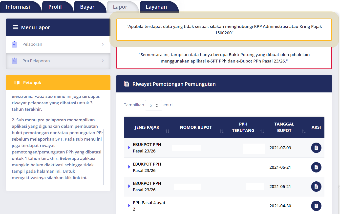 Dengan adanya fasilitas ini, wajib pajak dapat mengecek bukti fisik yang sudah didapat wajib pajak dengan data yang dilaporkan oleh lawan transaksi wajib pajak. Wajib pajak tetap perlu melakukan pengadministrasian fisik dari bukti potong dari lawan transaksi wajib pajak. Pada bagian ini riwayat pemotongan/pemungutan PPh dibatasi untuk 1 tahun terakhir. Apabila terdapat data bukti potong/pungut yang tidak sesuai, wajib pajak dapat menghubungi Kring Pajak 1500200 atau KPP administrasi.