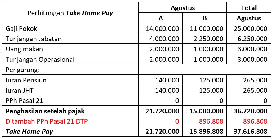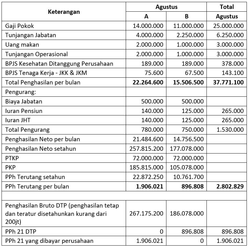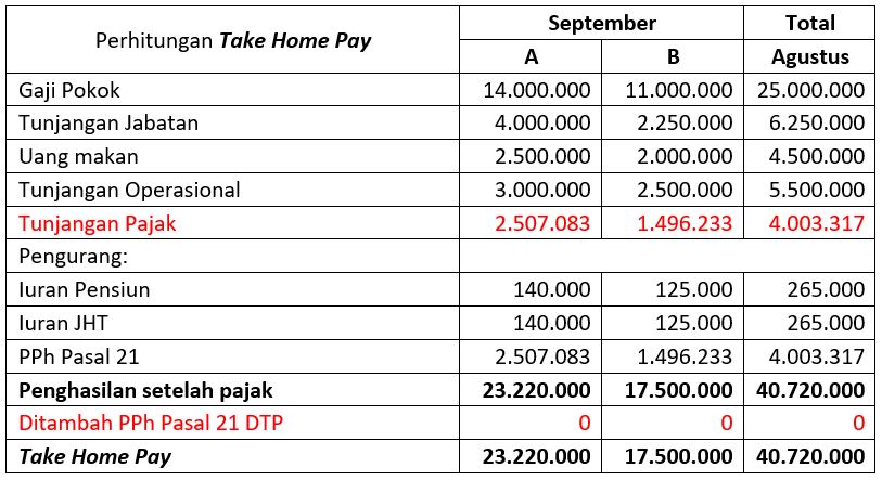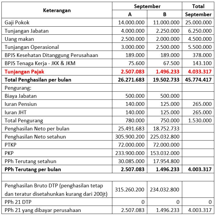 Bulan September, ternyata A dan B jika penghasilan brutonya disetahunkan mereka berdua tidak mendapatkan fasilitas PPh 21 DTP karena penghasilan brutonya melebihi Rp 200.000.000.